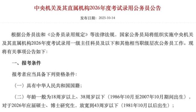 侠客岛:国考放宽年龄开了个好头 回应社会关切最近,国考年龄放宽的消息引发了广泛关注。根据中央机关及其直属机构2026年度考试录用公务员公告,公务员招录年龄上限由往年的35周岁调整为38周岁,对应届硕士、博士研究生,则放宽到43周岁以下。消息一出,热议不断