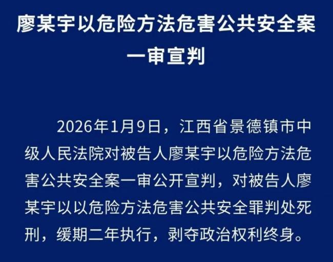 “一家三口被撞身亡案”宣判 肇事者获死缓判决1月9日,景德镇中院对“景德镇一家三口被撞身亡案”进行了宣判。被告人廖某宇因以危险方法危害公共安全罪被判处死刑,缓期二年执行,剥夺政治权利终身