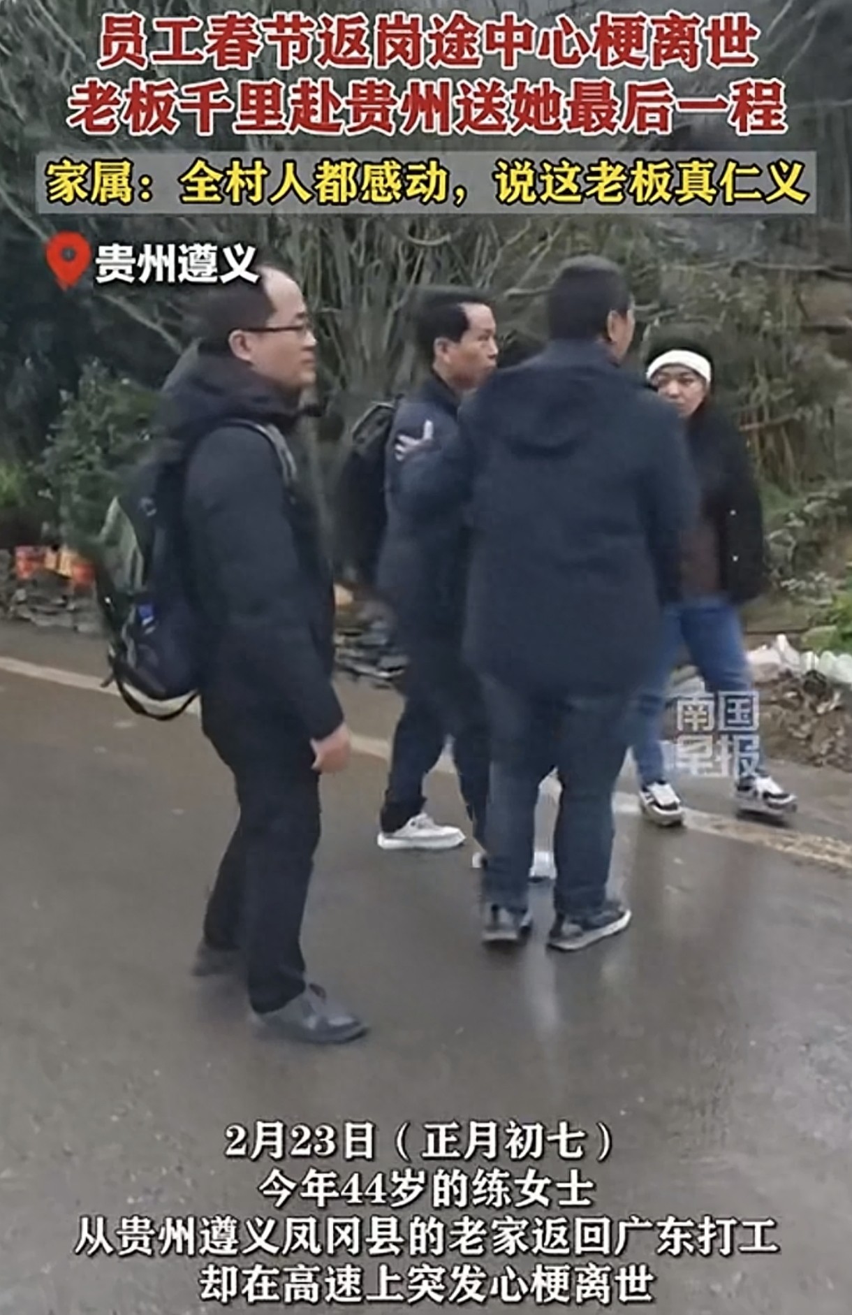 员工离世 老板赴贵州送别 工厂老板千里送行今年44岁的练女士春节后从贵州老家返回广东打工,途中在高速上突发心梗离世。出殡前,工厂老板和员工乘坐飞机并包车赶到练女士老家送她最后一程。医生诊断练女士为心肌梗死。村里人对老板的行为感到非常感动,称赞他为人很好